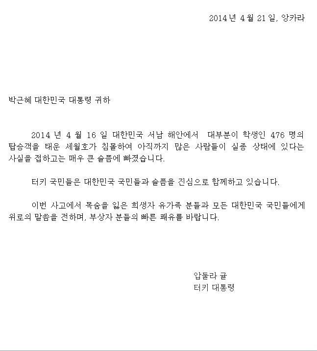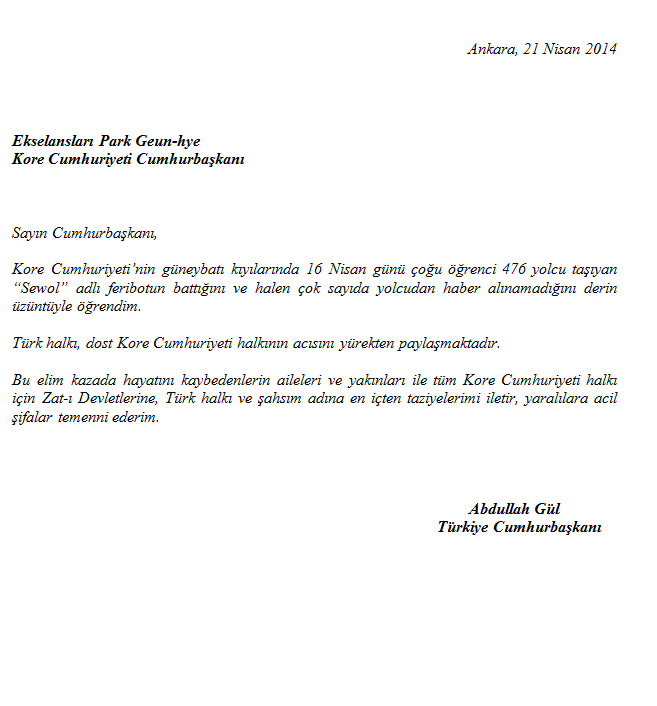 Cumhurbaşkanımız Sayın Abdullah Gül, 16 Nisan 2014 sabahı Güney Kore’nin güney batı kıyılarında meydana gelen feribot kazasından dolayı Güney Kore Cumhurbaşkanı Park Geun-hye'ye örneği aşağıda sunulan taziye mesajını göndermiştir.