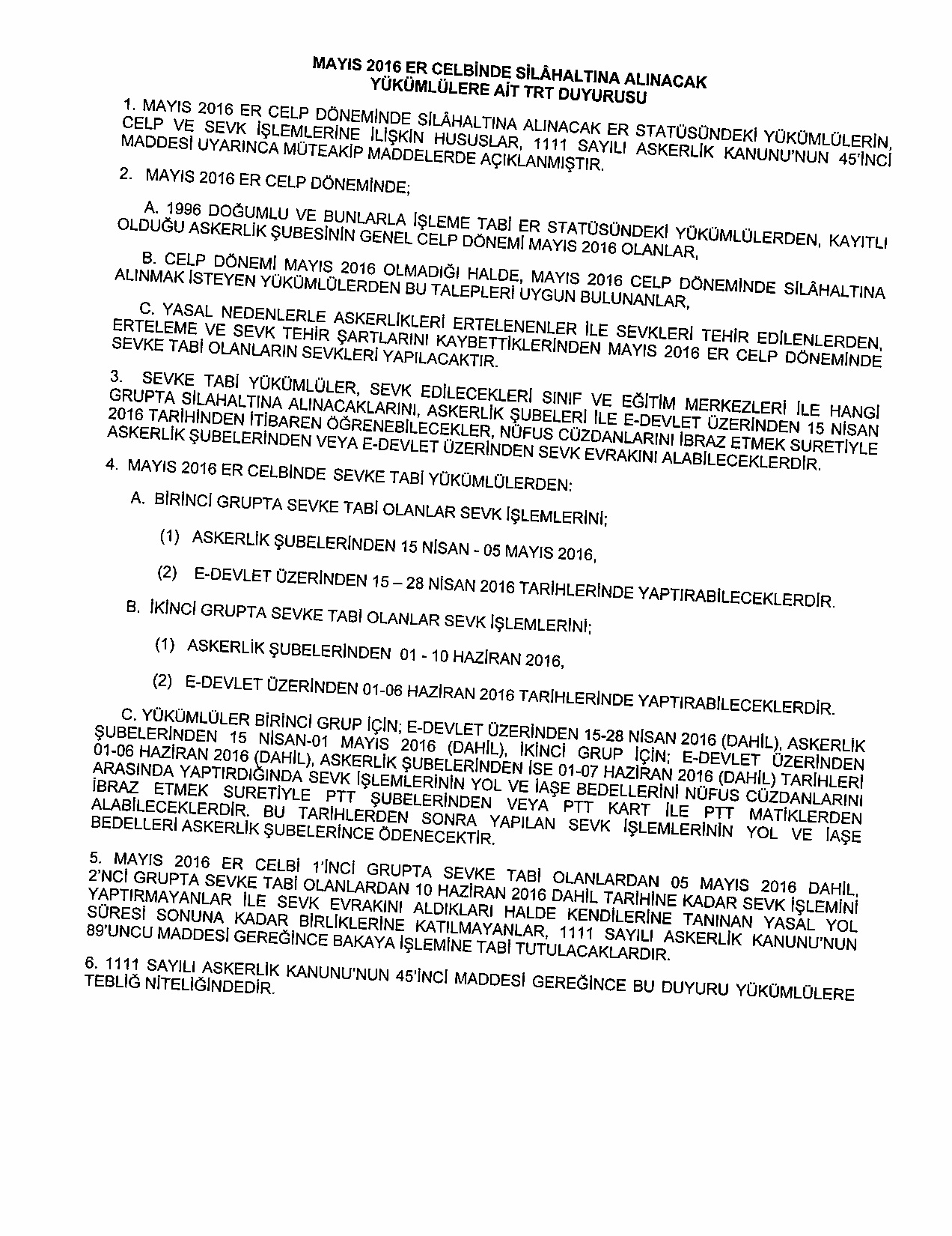 Mayıs2016er celp döneminde silah altına alınacak er statüsündeki yükümlülerin, celp ve sevk faaliyetlerine ait tebliğ yerine geçecek Milli Savunma Bakanlığıduyurusu ekte sunulmaktadır.