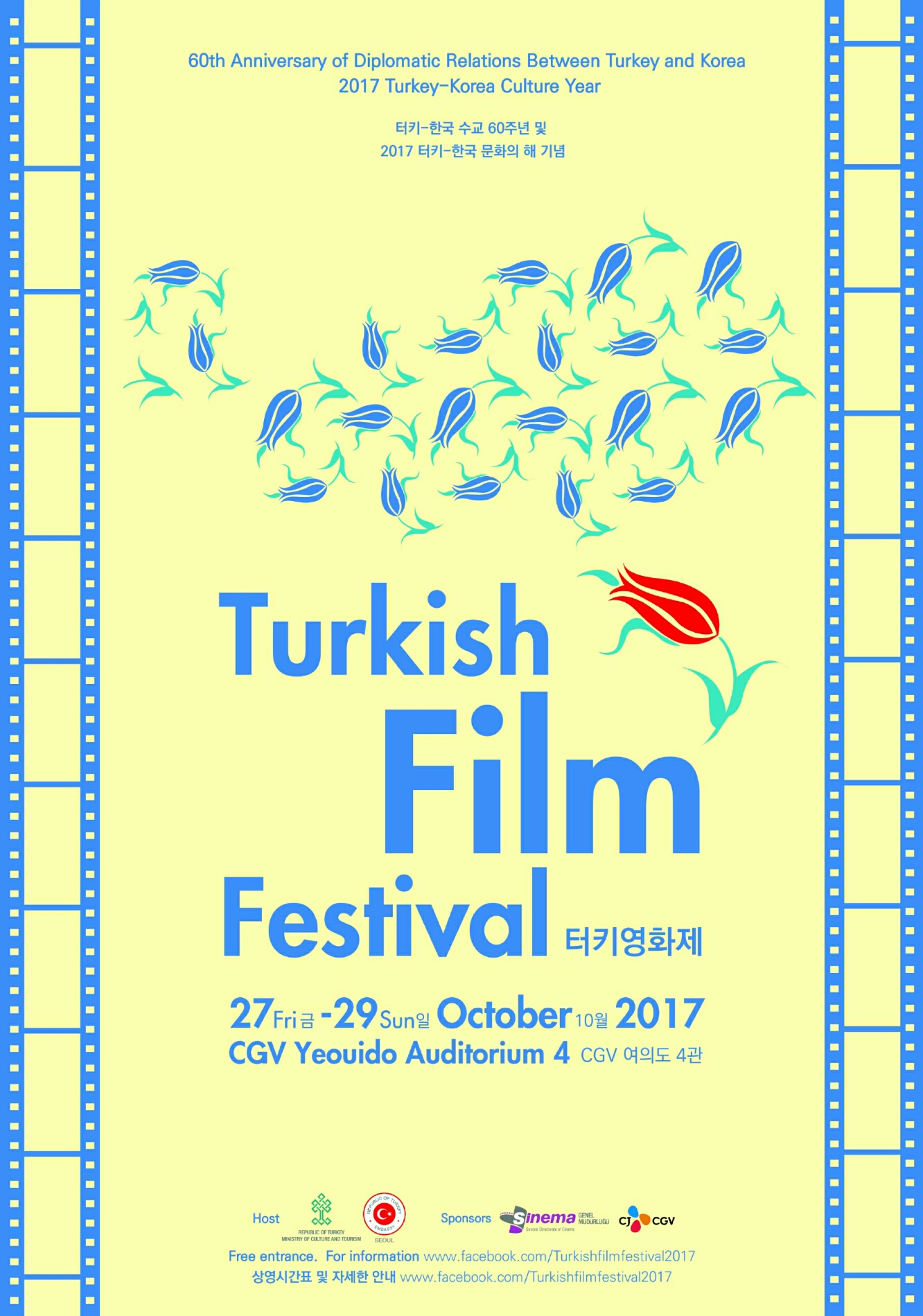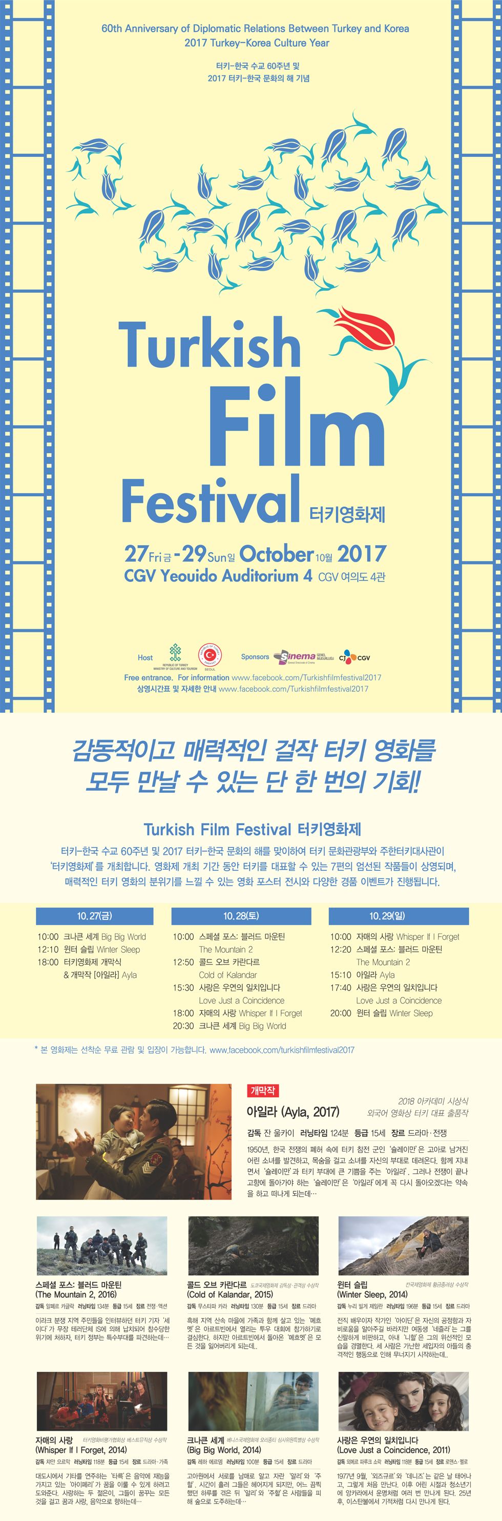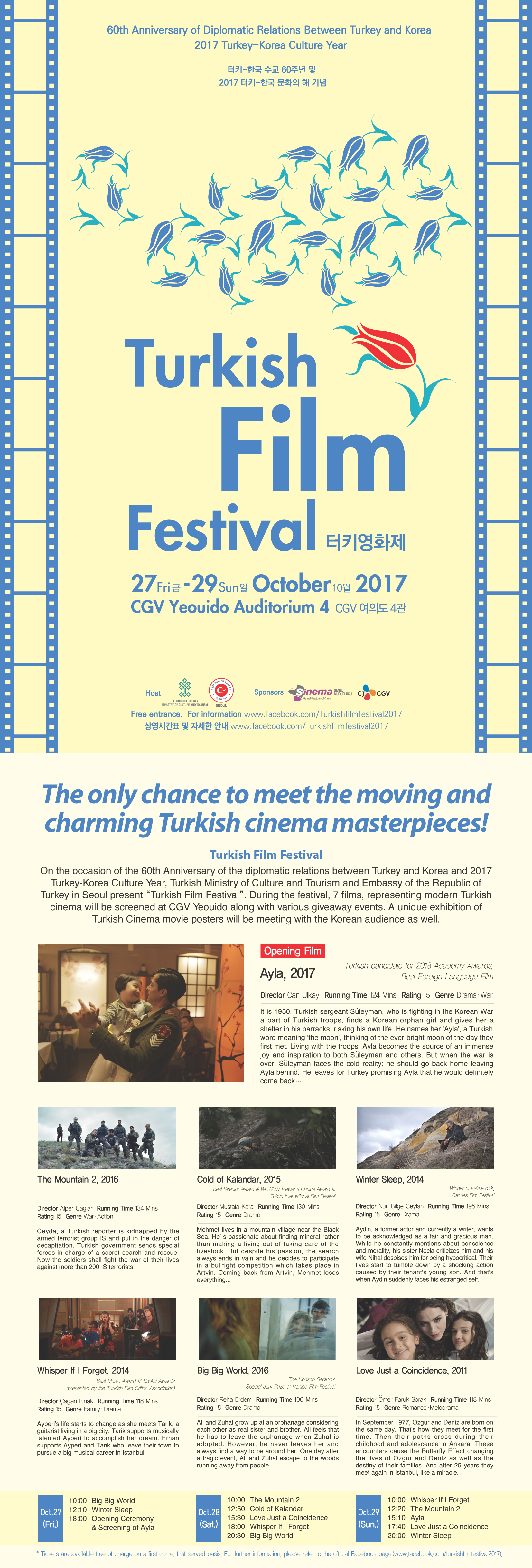 27-29 EKİM TÜRK FİLM FESTİVALİ- CGV YEOUIDO! 2017 Türkiye-Kore Kültür Yılı vesilesiyle Büyükelçiliğimiz, T.C. Kültür ve Turizm Bakanlığı ve CJ CGV’nin işbirliğinde CGV Yeouido’da 27-29 Ekim’de “Türk Filmleri Festivali” düzenleyecektir. Festivalin açılış filmi, Türkiye’nin En