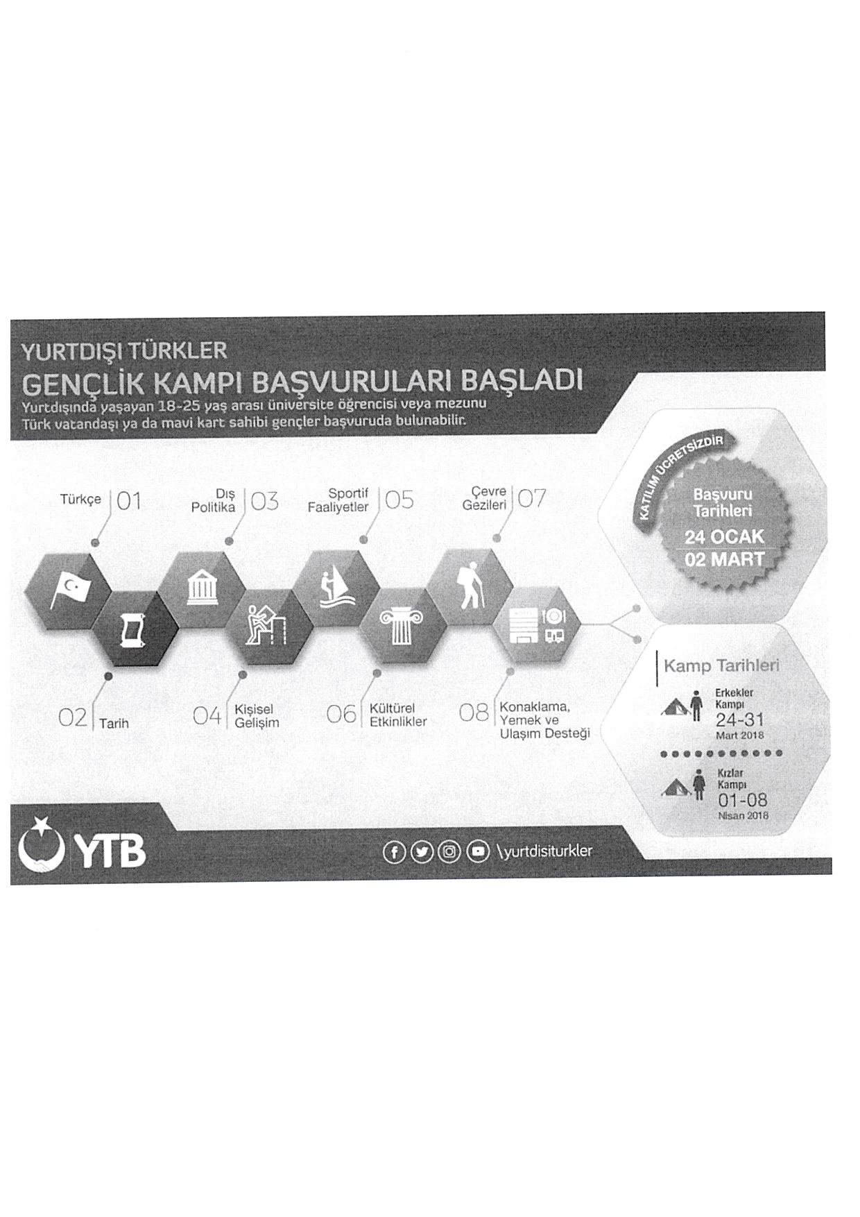 Yurtdışında yaşayan gençlerimiz kampa katılabilmek için 24.01.2018 – 02.03.2018 tarihleri arasında başvuru yapabilecektir.