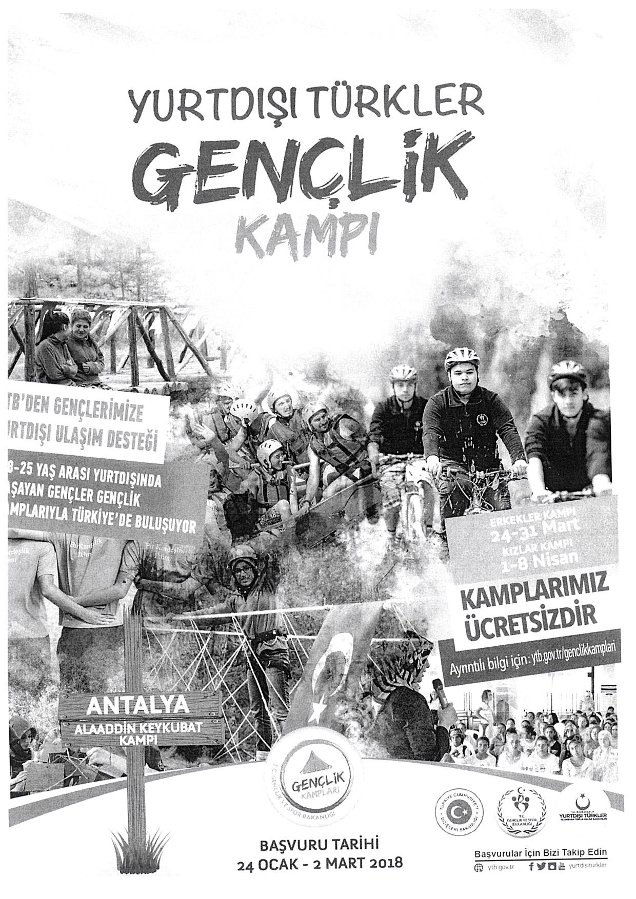 Dışişleri Bakanlığı, Gençlik ve Spor Bakanlığı ve Yurtdışı Türkler ve Akraba Topluluklar Başkanlığı’nın işbirliğiyle her yıl düzenlenen "Gençlik Kampları"nın bu yıl ilk bölümüAntalya Alaeddin Keykubat Kampı'nda,24 Mart-8 Nisan 2018 tarihleri arasında kızlar ve erkekler için ayrı dönemlerde gerçekleştirilecektir.
