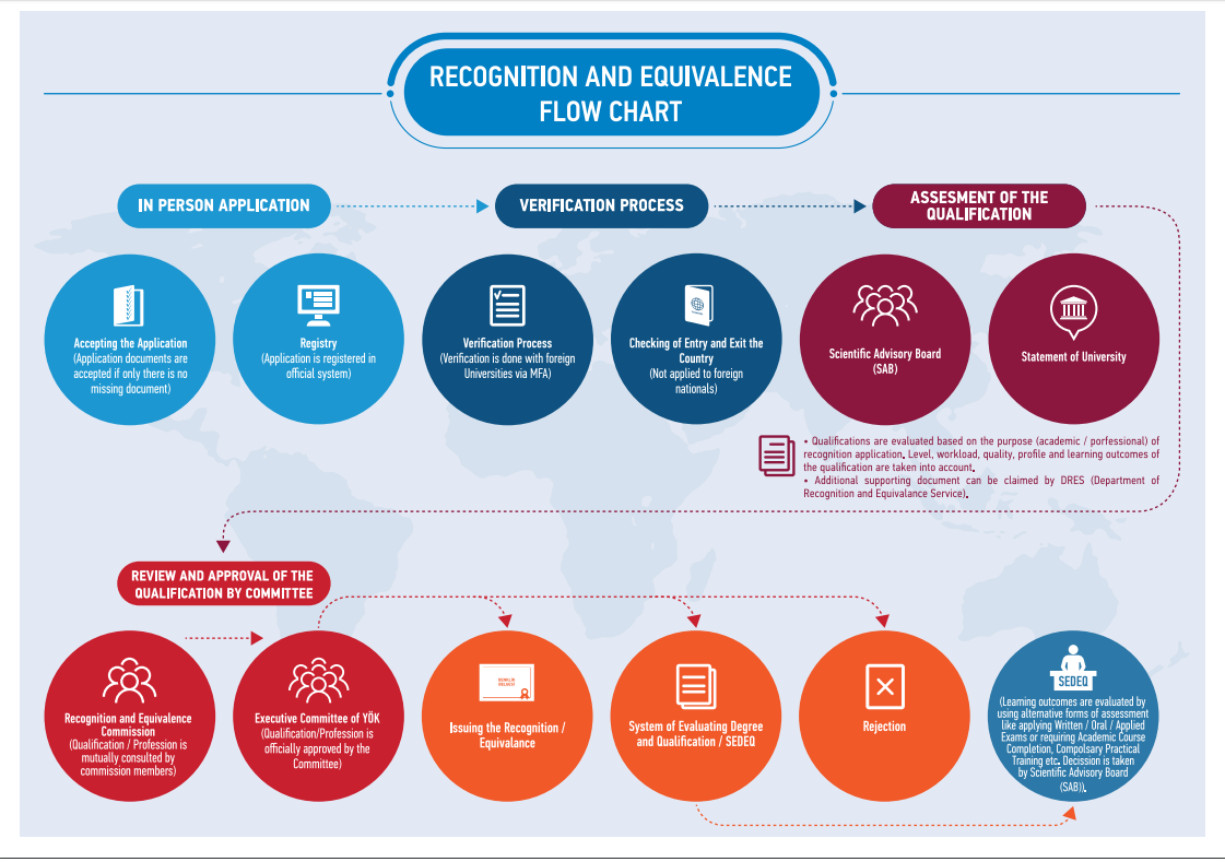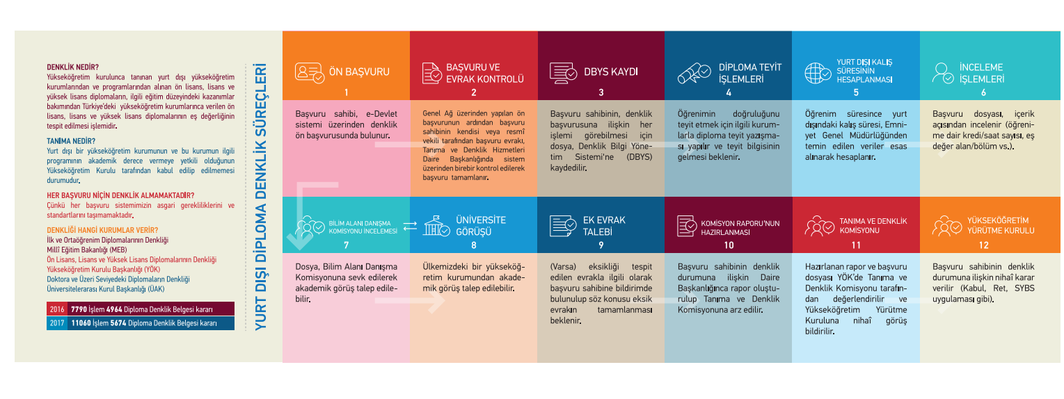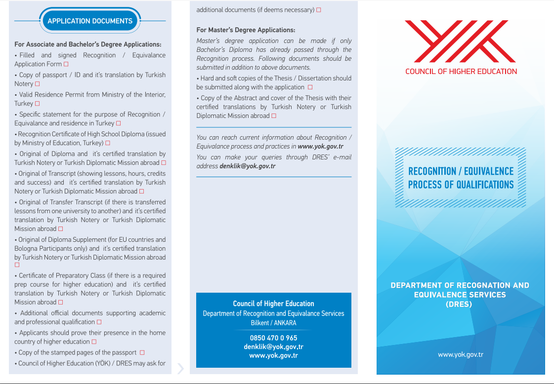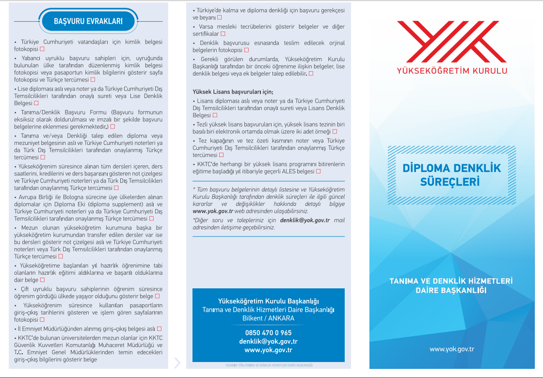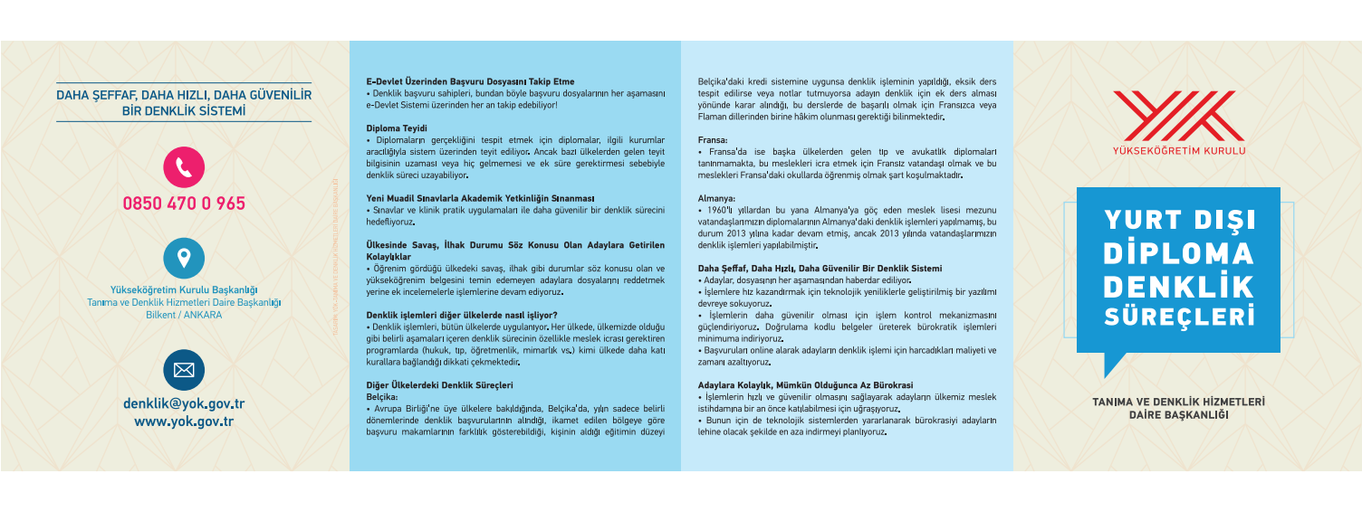 Yükseköğretim Kurulu Başkanlığı’nın (YÖK) yurt dışında ön lisans, lisans ve yüksek lisans düzeyindeki öğrenimlerin ardından alınan diplomaların ülkemizde tanıma ve denklik işlemlerine ilişkin bilgileri içeren broşürleri ekte sunulmaktadır.