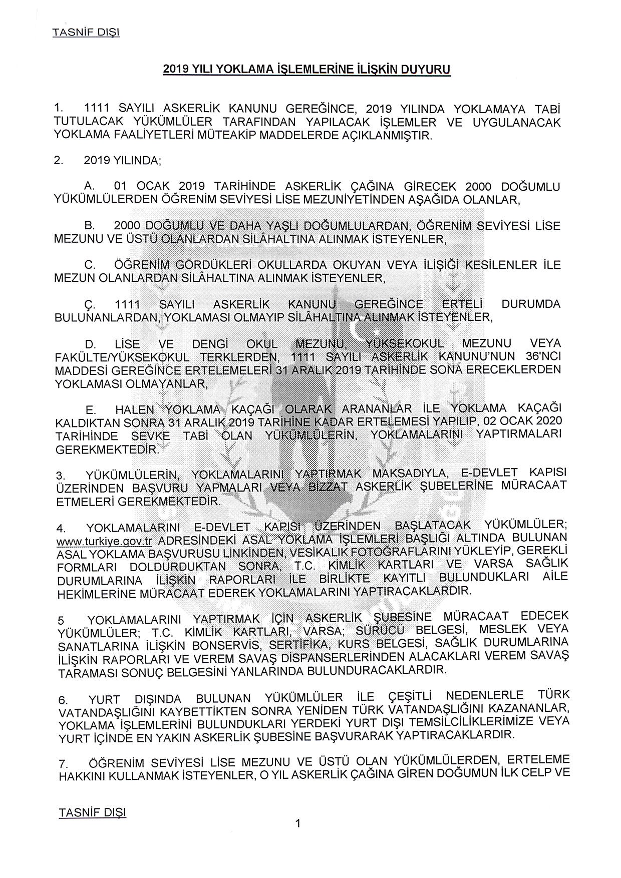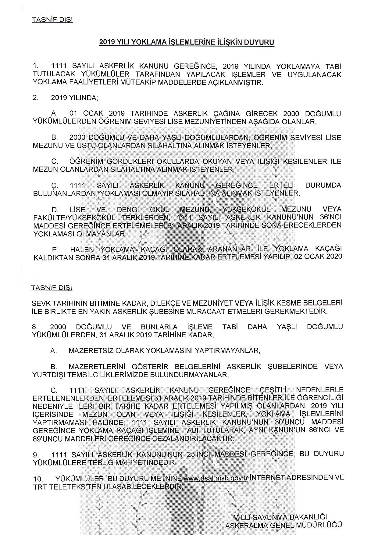 1111 sayılı Askerlik Kanunu gereğince,2000 doğum ve bu doğumlularla işleme tabi yükümlülerin yoklama işlemlerine ait tebliğ yerine geçecek Milli Savunma Bakanlığı'nın duyurusu ektesunulmaktadır.